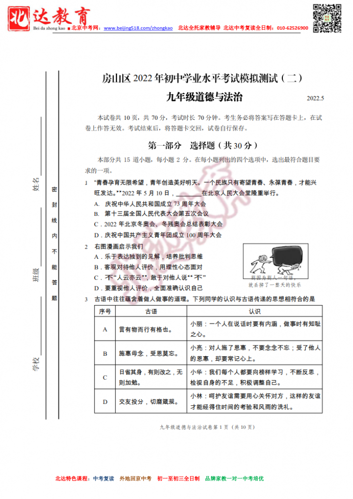 北京房山2022初三二模道法试题及答案(高清版)!admw360中考复读学校教研组收集整理,分享给大家。