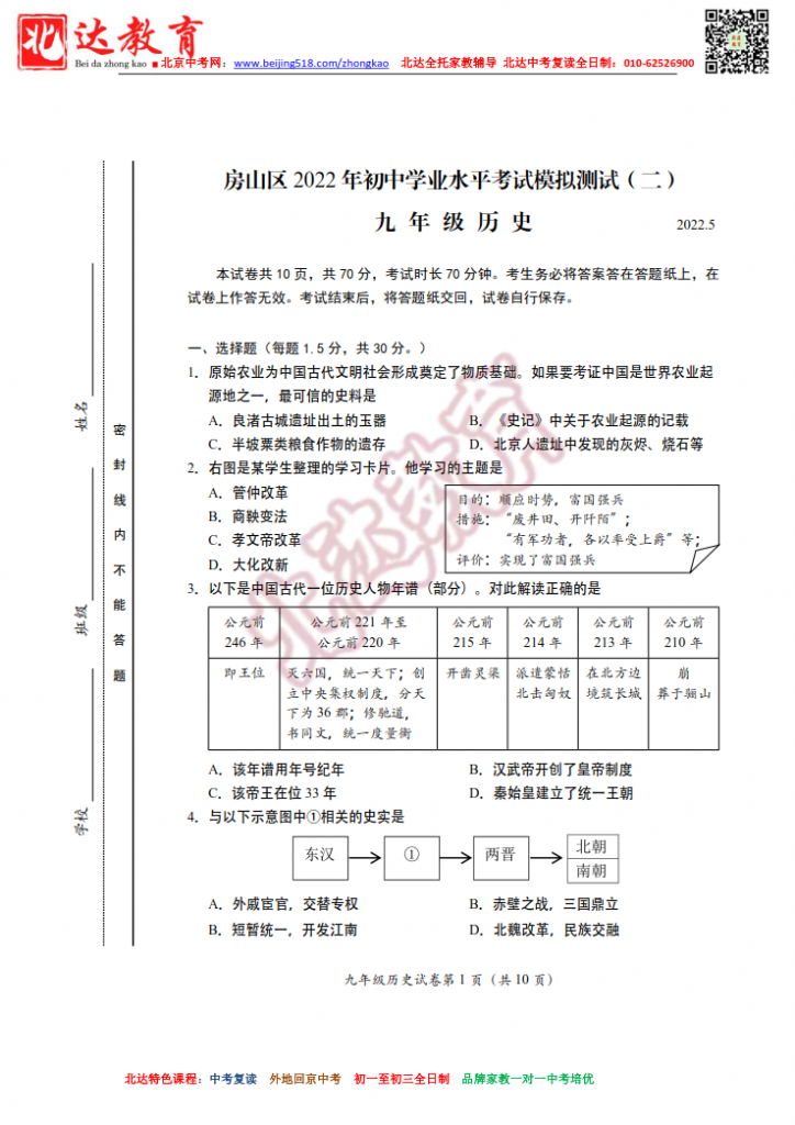 北京房山2022初三二模历史试题(高清版)!admw360中考复读学校教研组收集整理,分享给大家。