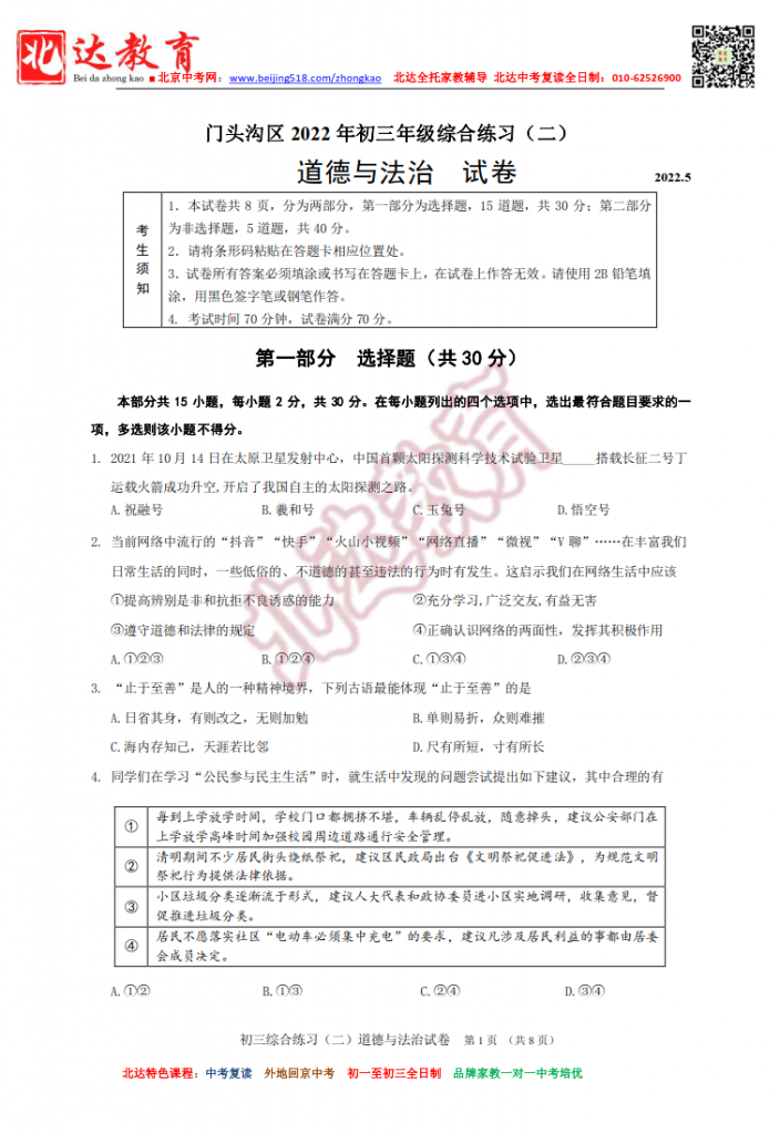 北京门头沟2022初三二模道法试题及答案(高清版)!admw360中考复读学校教研组收集整理,分享给大家。