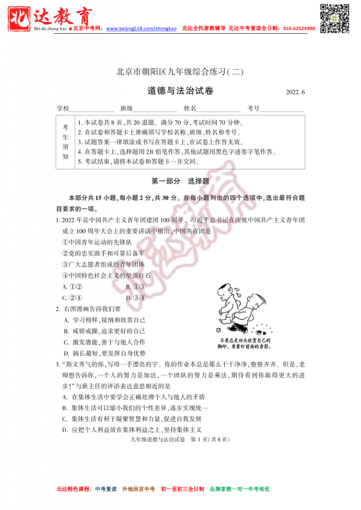 北京朝阳2022初三二模道法试题(高清版)!admw360中考复读学校教研组收集整理,分享给大家。