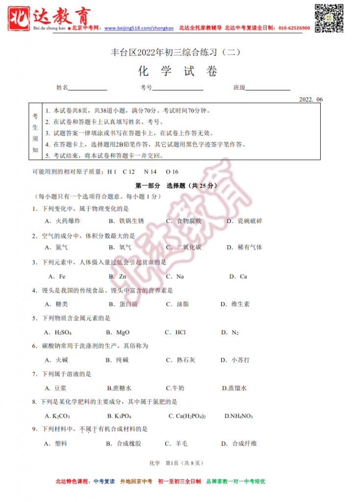 北京丰台2022初三二模化学试题及答案(高清版)!admw360中考复读学校教研组收集整理,分享给大家。