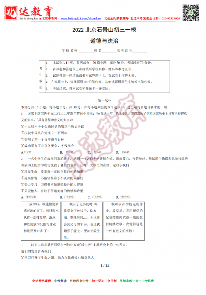 北京石景山2022初三二模道法试题及答案(高清版)!admw360中考复读学校教研组收集整理,分享给大家。