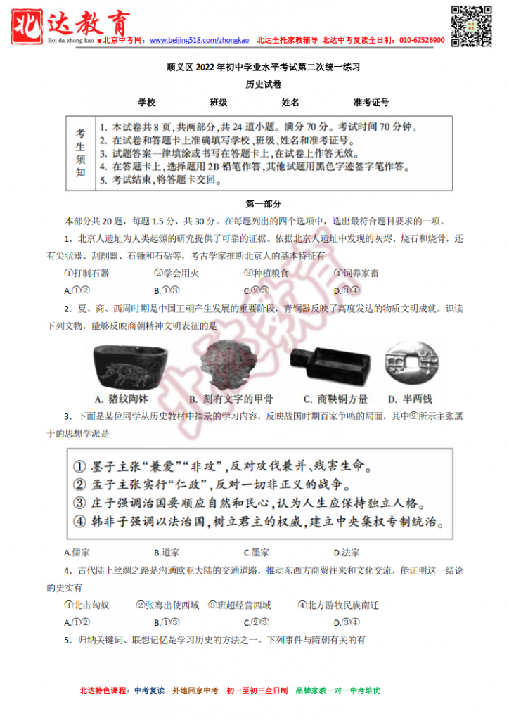 北京顺义2022初三二模历史试卷及答案(高清版)!admw360中考复读学校教研组收集整理,分享给大家。