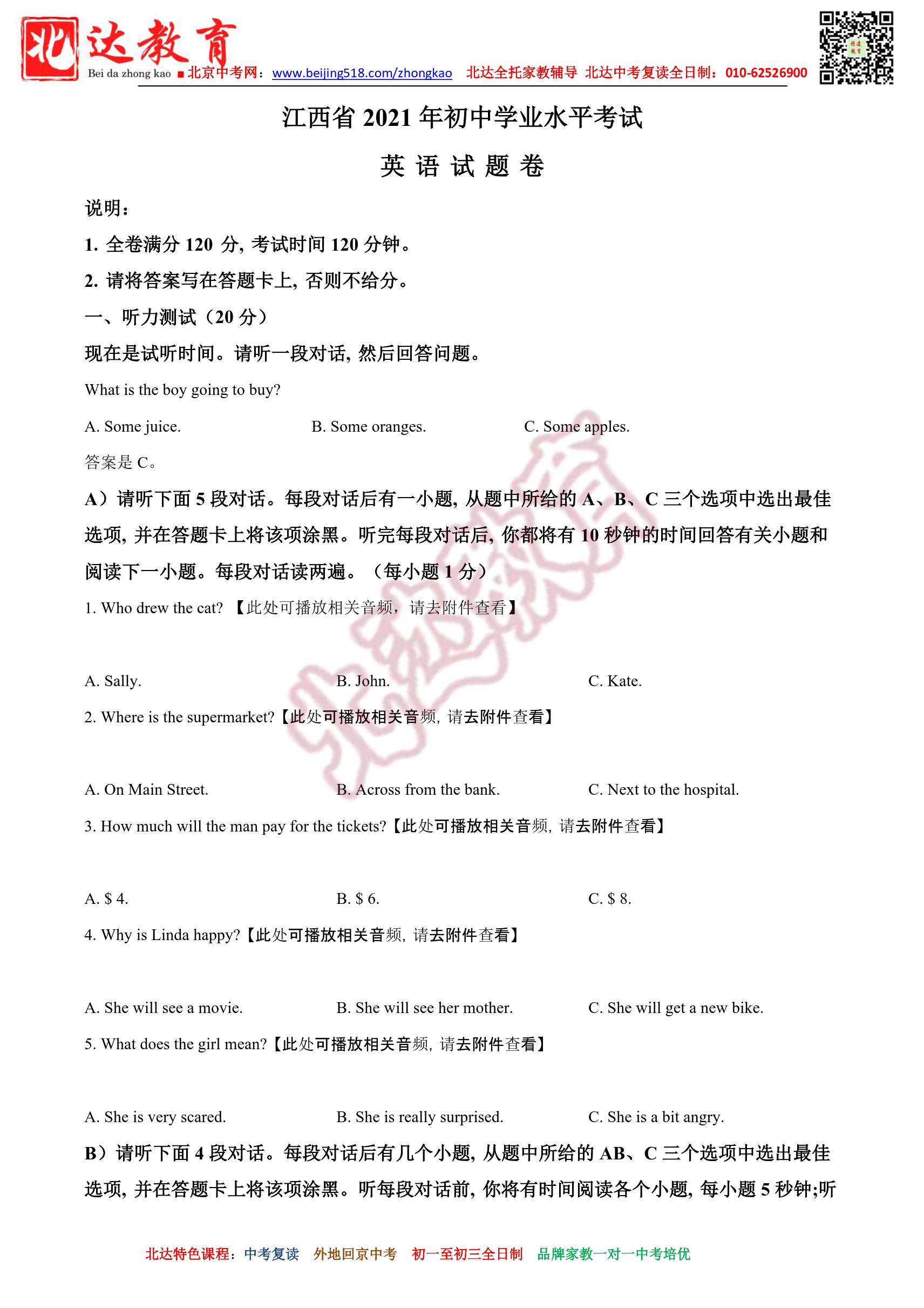2021年江西中考英语试题及答案汇总。admw360教研组收集整理,分享给大家。