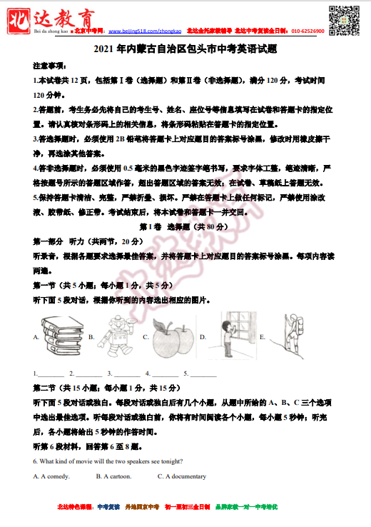 2021年内蒙古自治区包头市中考英语试题(原卷版)