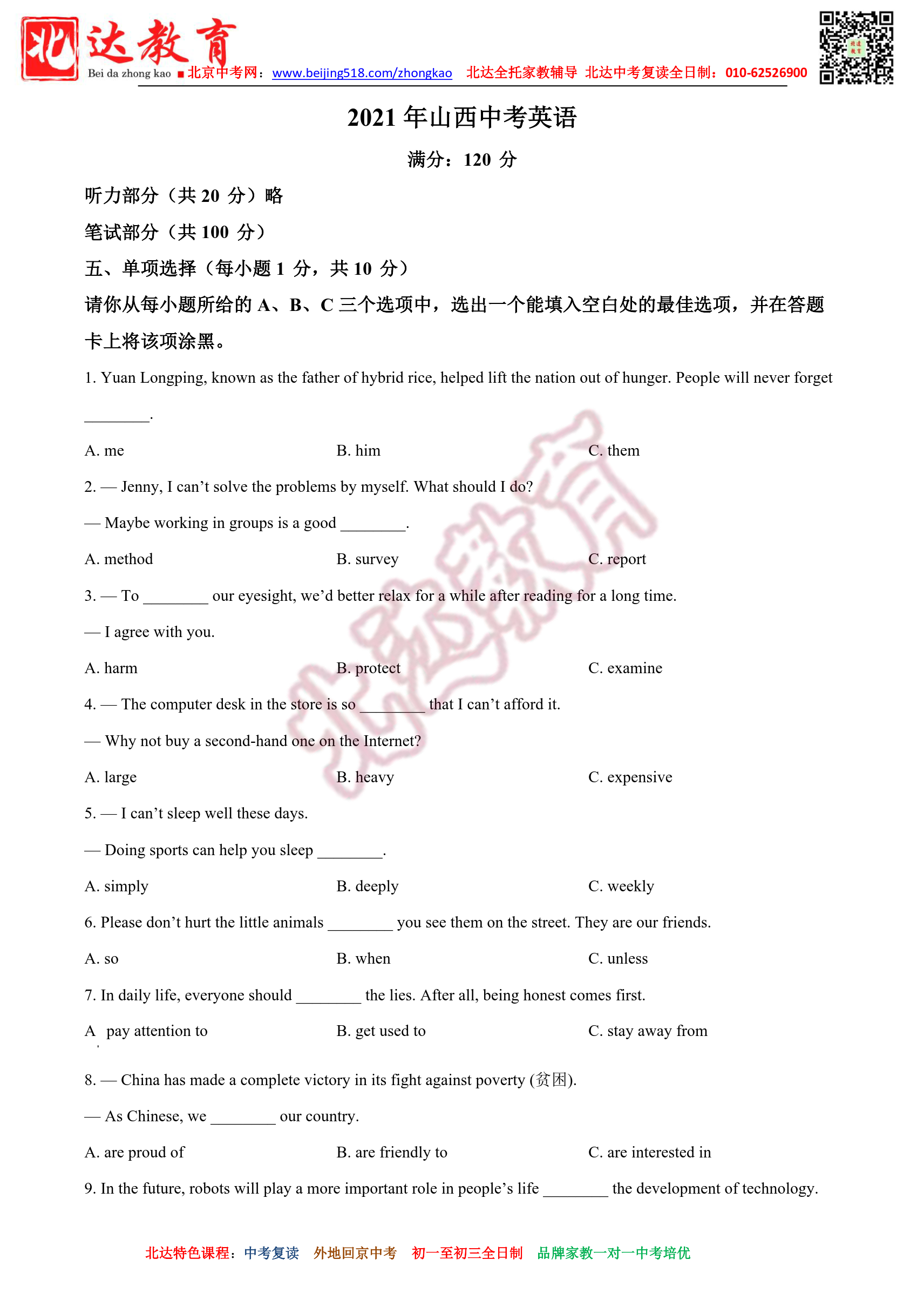 2021年山西中考英语试题及答案汇总。admw360教研组收集整理,分享给大家。