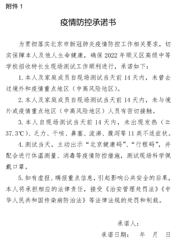 2、参加测试考生需自行下载打印疫情防控承诺书(见文后附件1)考生本人签字,报到时交给报到处。
