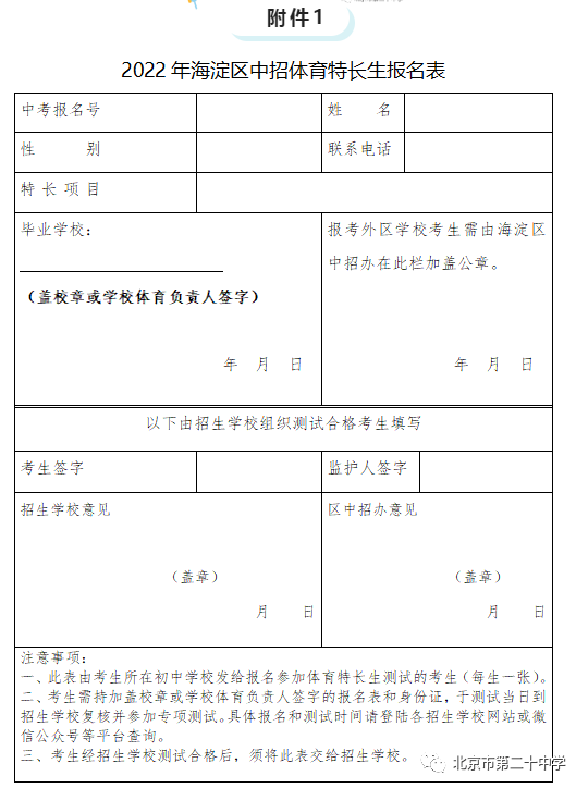 2.报名方式:学校接收考生线上报名,在北京市第二十中学官网下载附件1《2022年海淀区中招体育特长生报名表》填写、扫描,与个人简历以PDF版一同发至邮箱:twzx20@163.com。