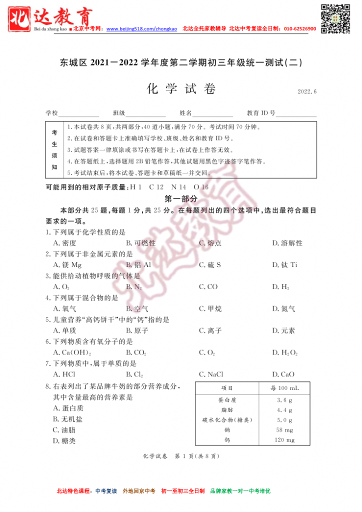 北京东城2022初三二模化学试题(高清版)!admw360中考复读学校教研组收集整理,分享给大家。