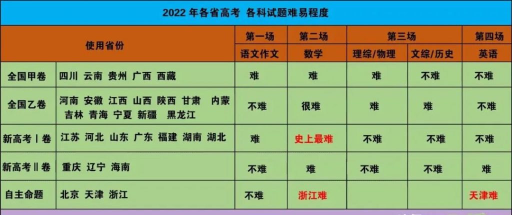 2022年全国各省高考各科试题难易程度如何?请看图表!admw360中考复读学校教研组收集整理,分享给大家。