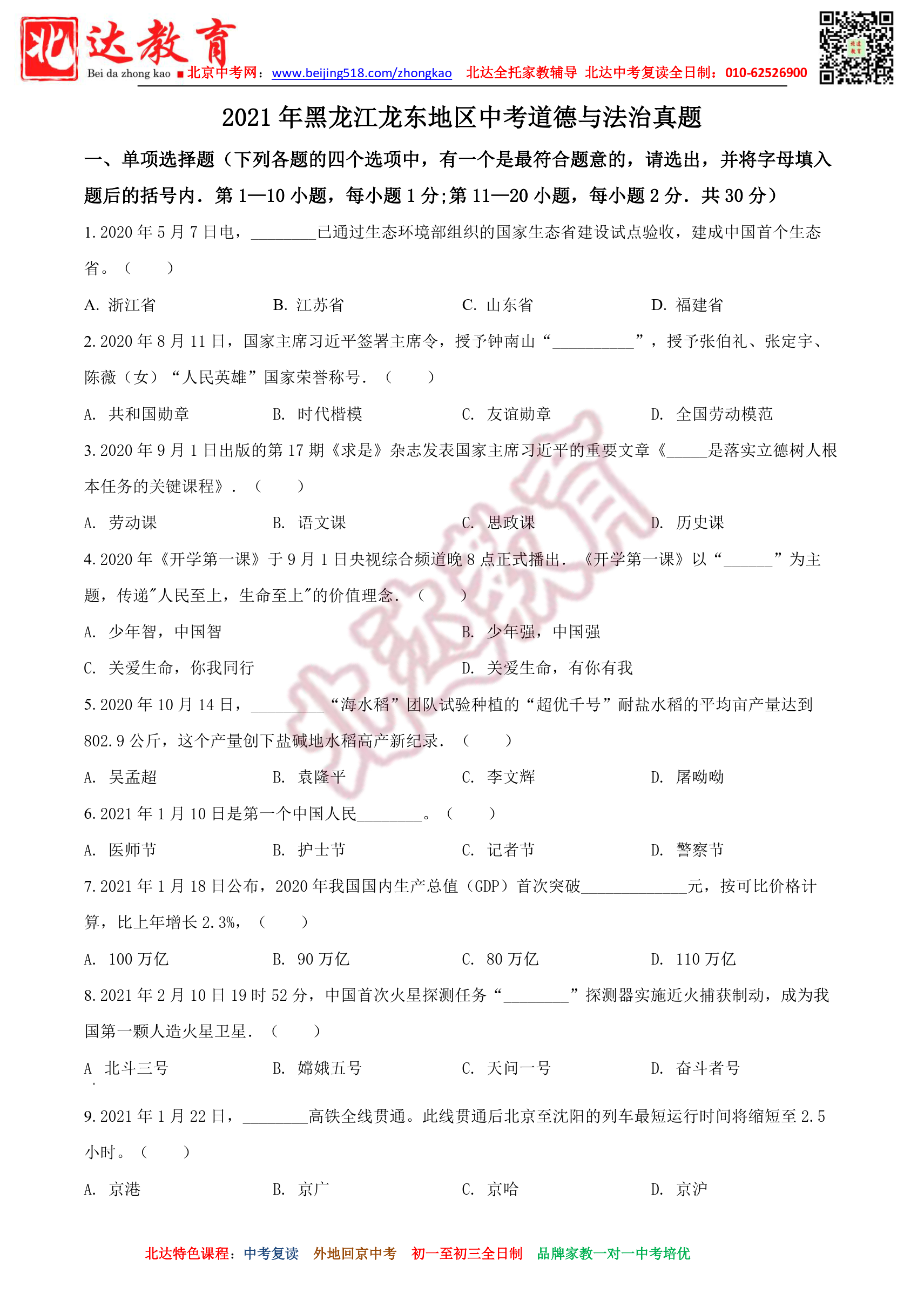 2021年黑龙江中考政治试题及答案汇总。admw360教研组收集整理,分享给大家。
