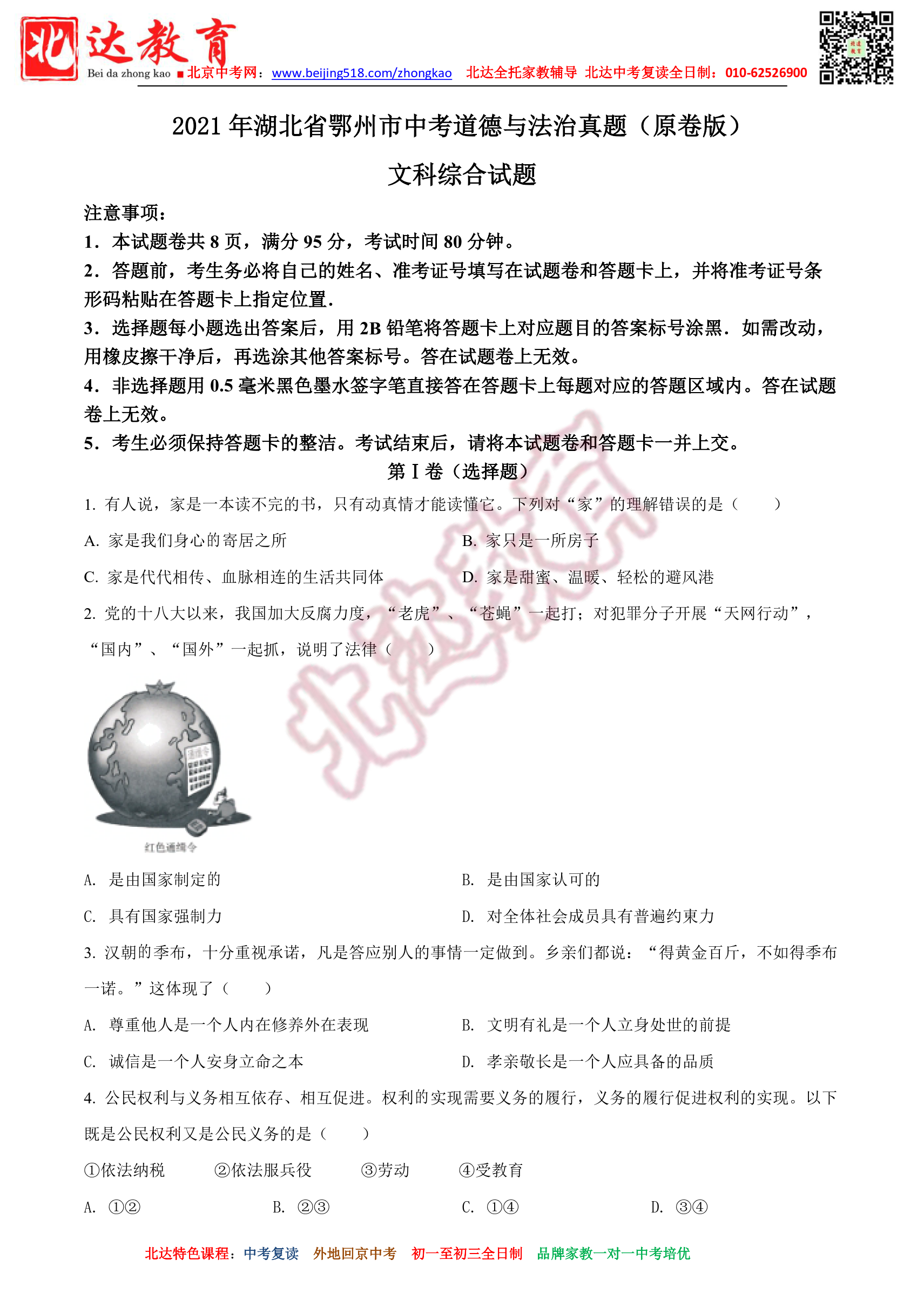 2021年湖北省鄂州市中考道德与法治真题(原卷版)