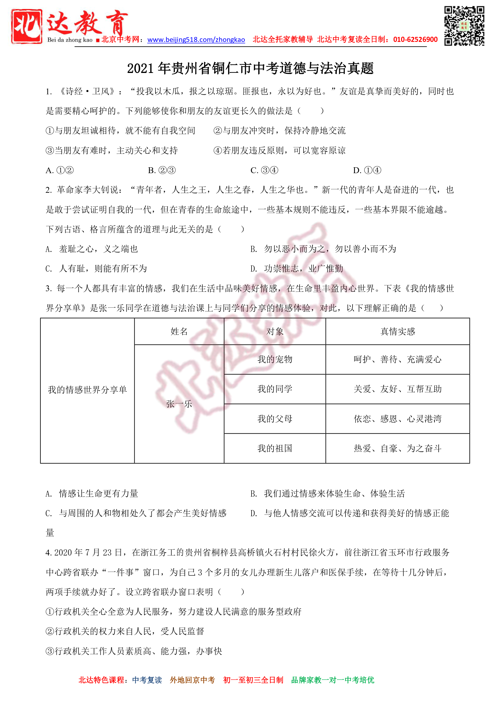 2021年贵州省铜仁市中考道德与法治真题(解析版)