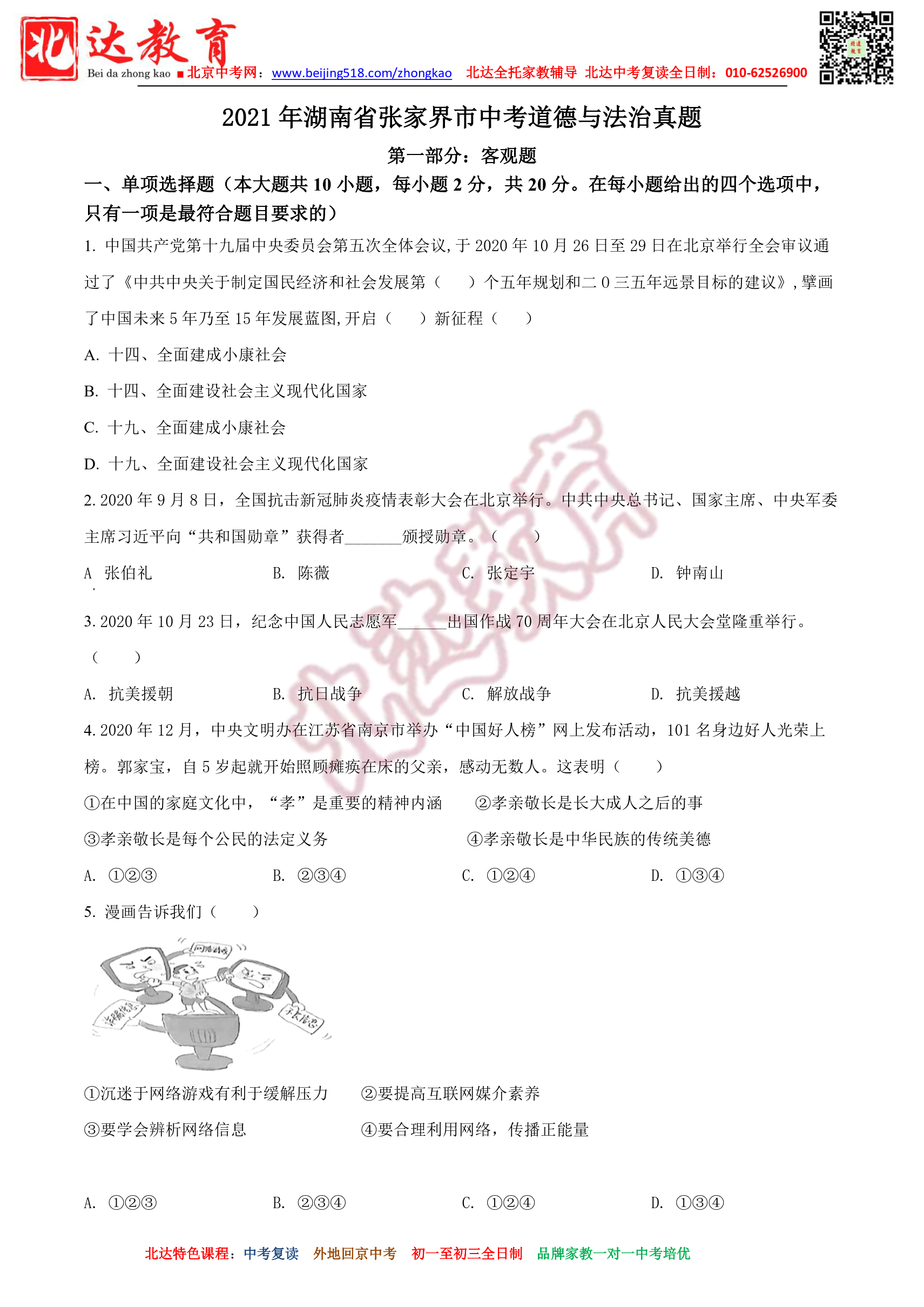 2021年湖南省张家界市中考道德与法治真题(原卷版)
