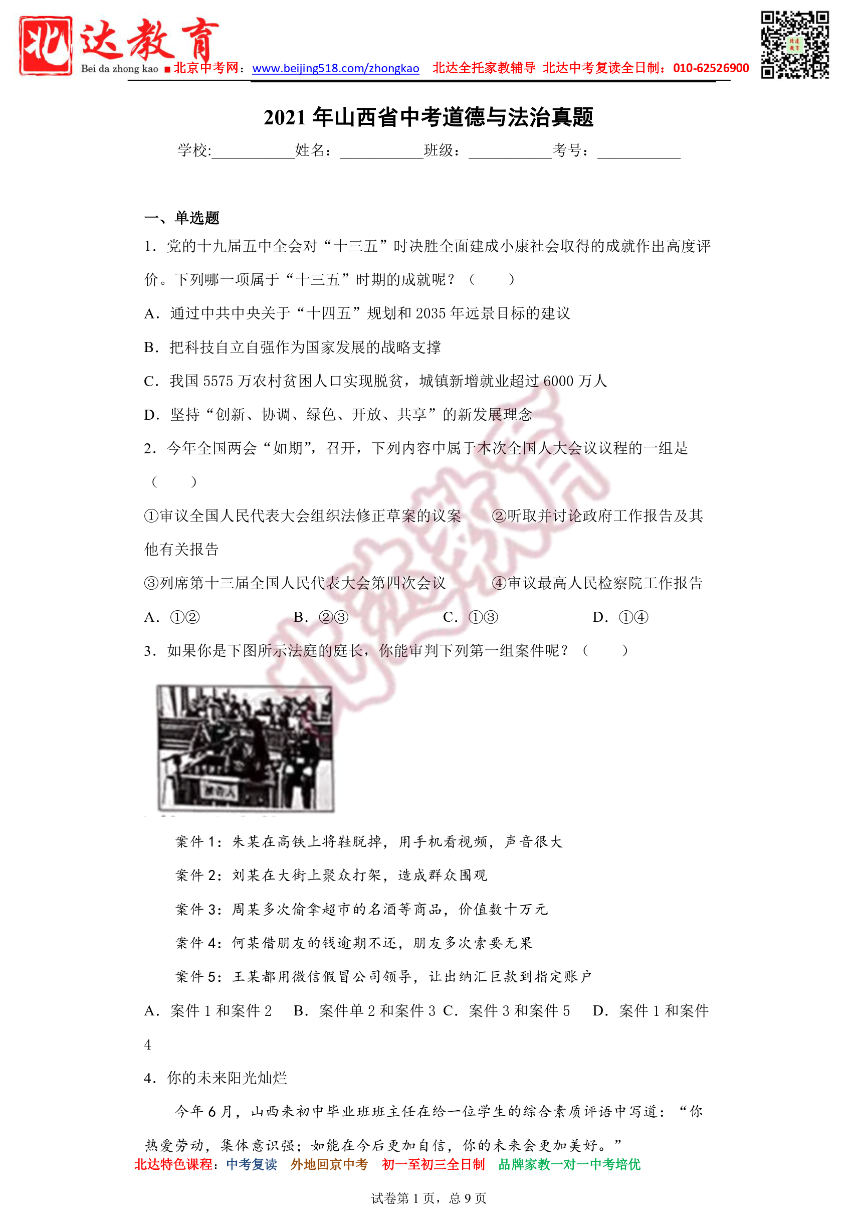 2021年山西中考政治试题及答案汇总。admw360教研组收集整理,分享给大家。
