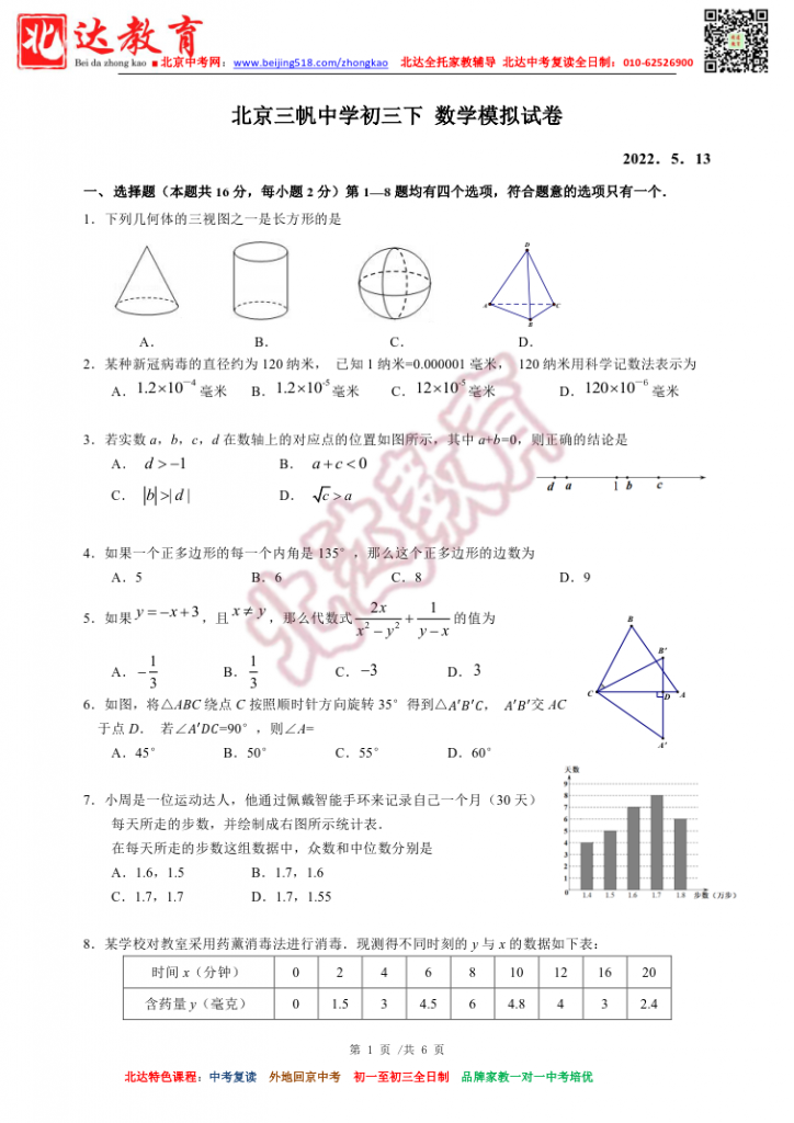 北京三帆中学2022初三下数学模拟试卷(高清版)。admw360中考复读学校教研组收集整理,分享给大家。