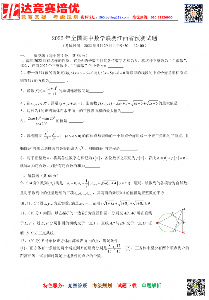 2022全国高中数学联赛江西省预赛试题(高清版)。admw360中考复读学校教研组收集整理,分享给大家。