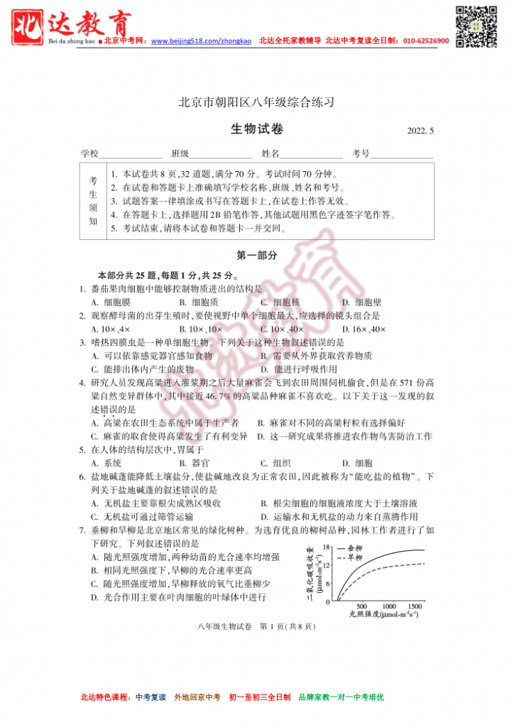 北京朝阳2022初中一模生物试题及答案(高清版)。admw360中考复读学校教研组收集整理,分享给大家。