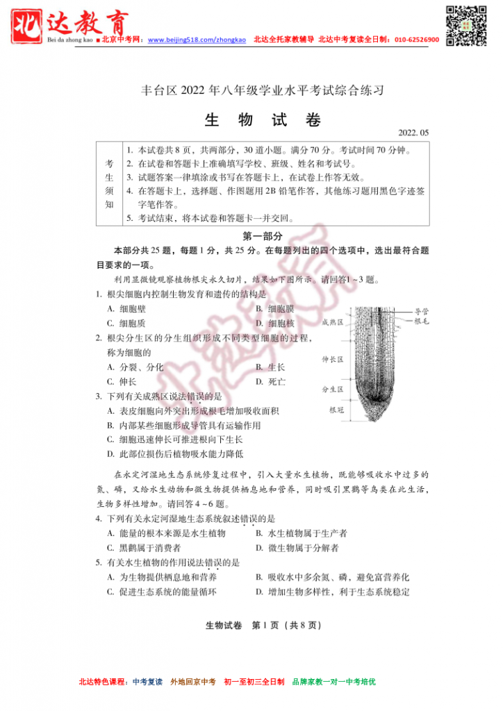 北京丰台2022初中一模生物试题及答案(高清版)。admw360中考复读学校教研组收集整理,分享给大家。