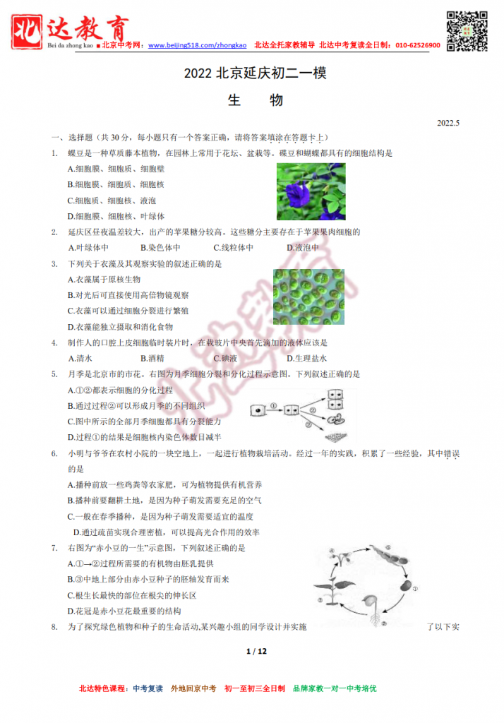 北京延庆2022初中一模生物试题及答案(高清版)。admw360中考复读学校教研组收集整理,分享给大家。