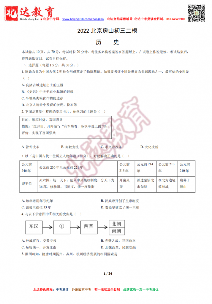 北京房山2022初三二模历史试题及答案(高清版)!admw360中考复读学校教研组收集整理,分享给大家。