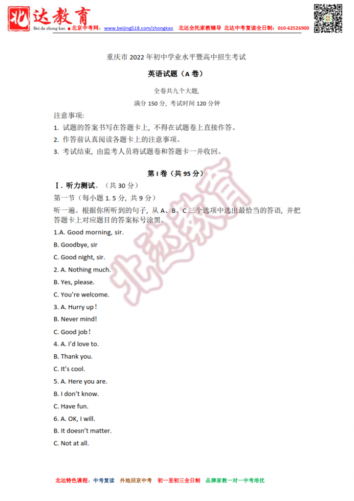 重庆2022中考各科真题含答案(高清版)。admw360中考复读学校教研组收集整理,分享给大家。