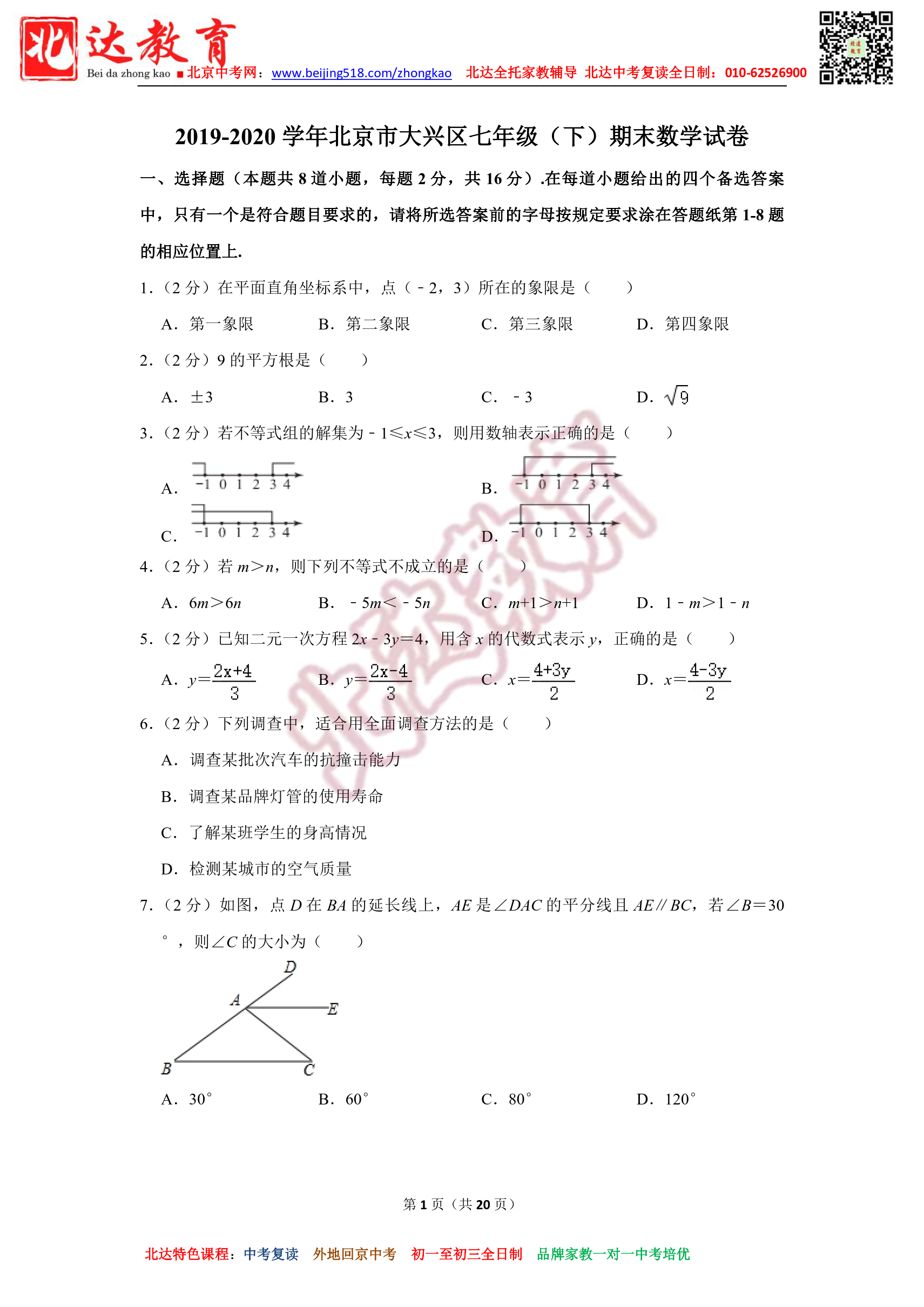 北京市大兴区2019-2020学年七年级(下)期末数学试卷及解析