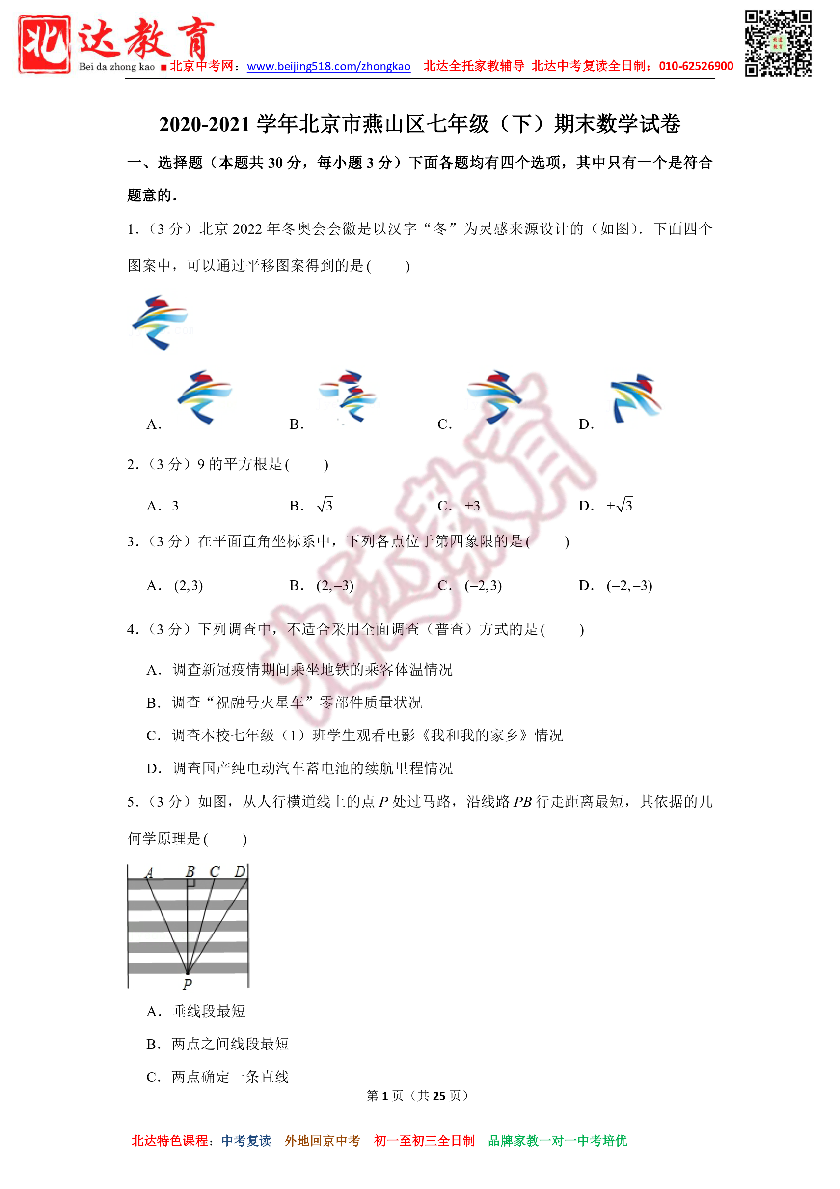 北京市燕山区2020-2021学年七年级(下)期末数学试卷及解析