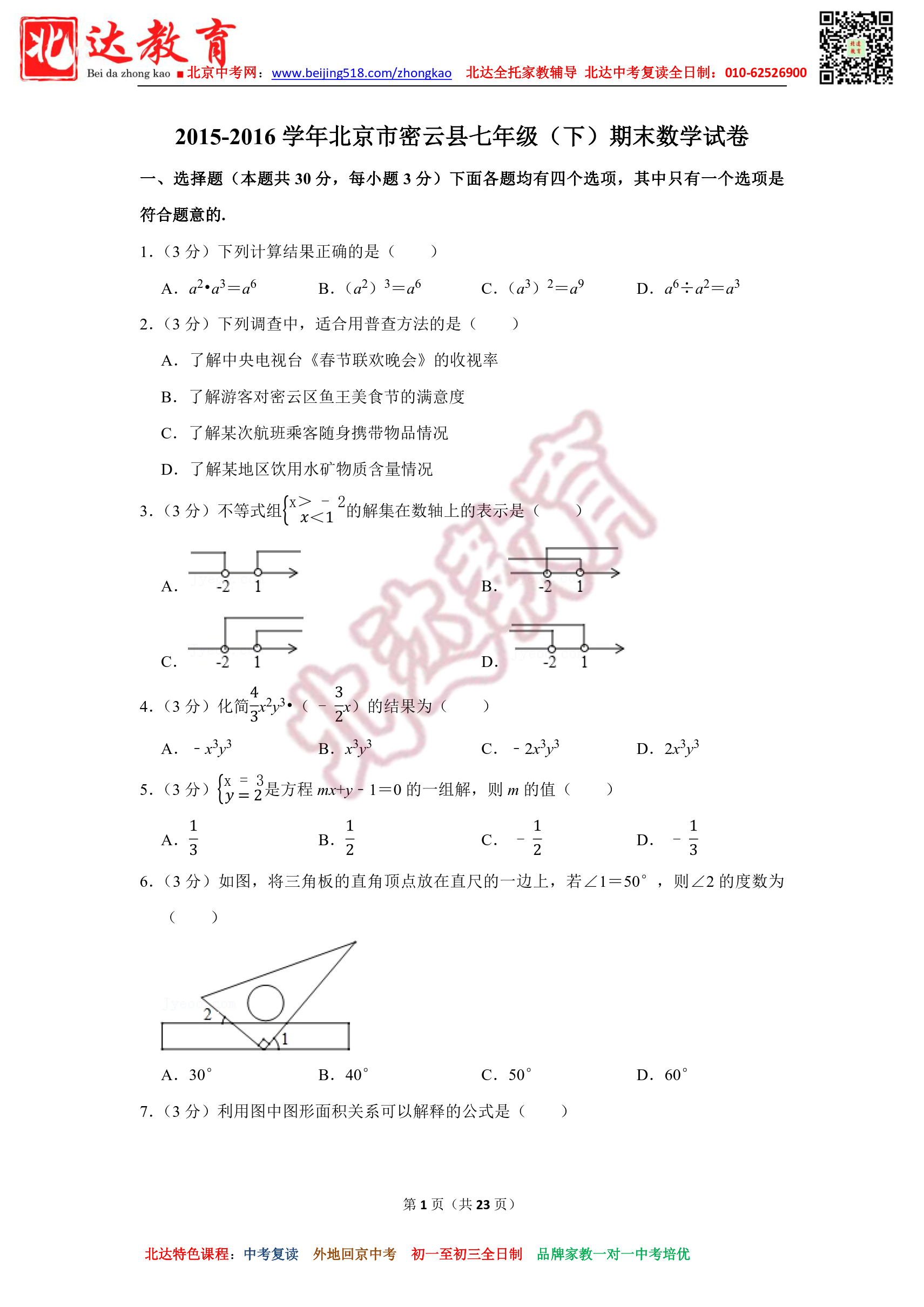 北京市密云县2015-2016学年七年级(下)期末数学试卷及解析