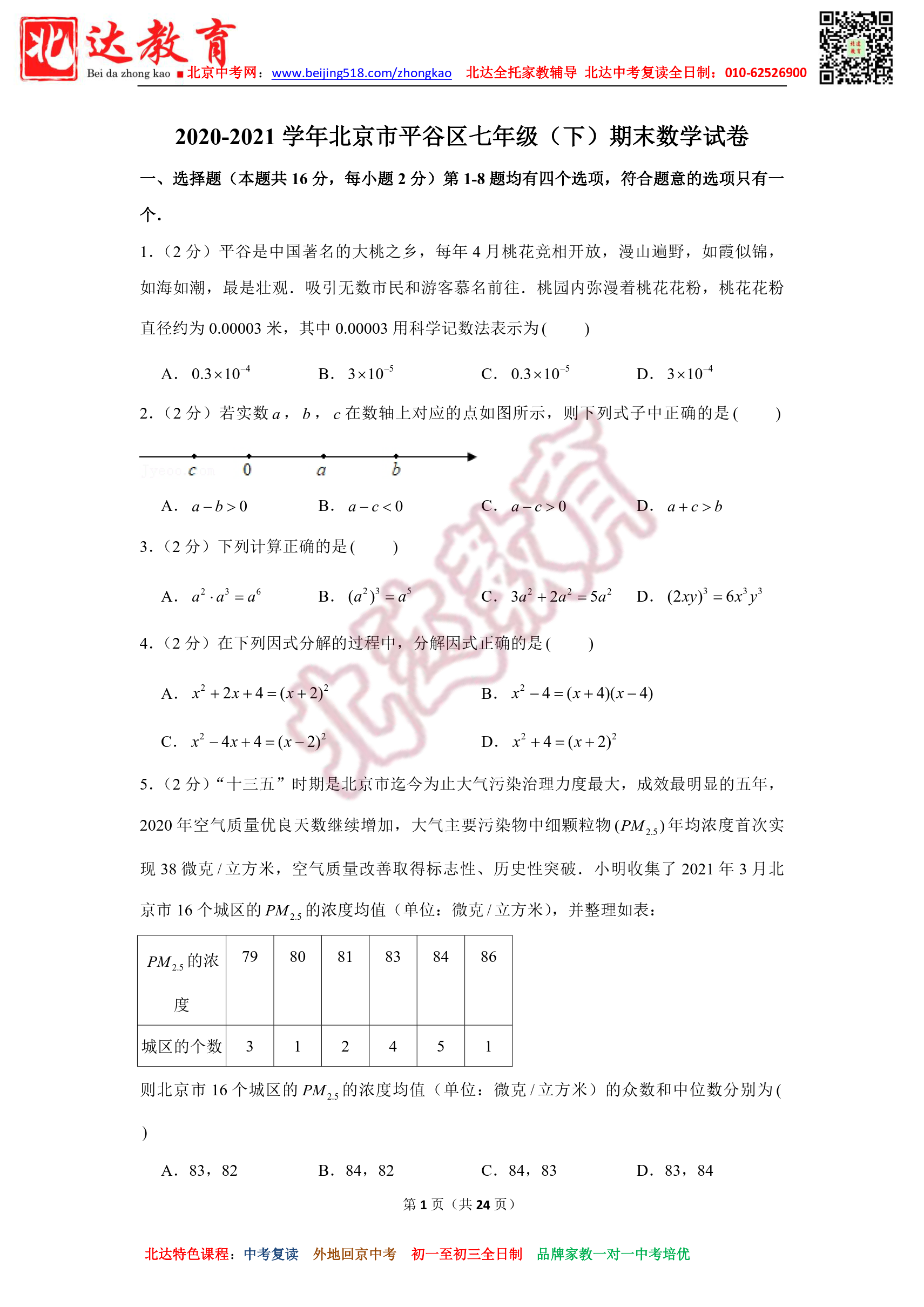 北京市平谷区2020-2021学年七年级(下)期末数学试卷及解析