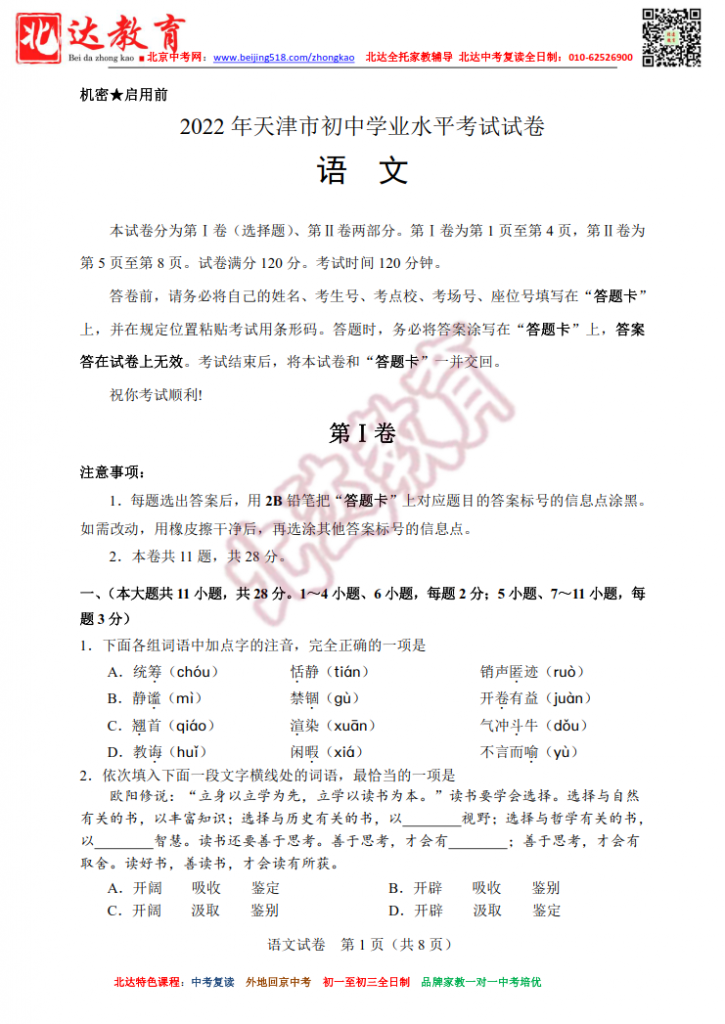 天津2022中考各科真题含答案(全科高清版)。admw360中考复读学校教研组收集整理,分享给大家。