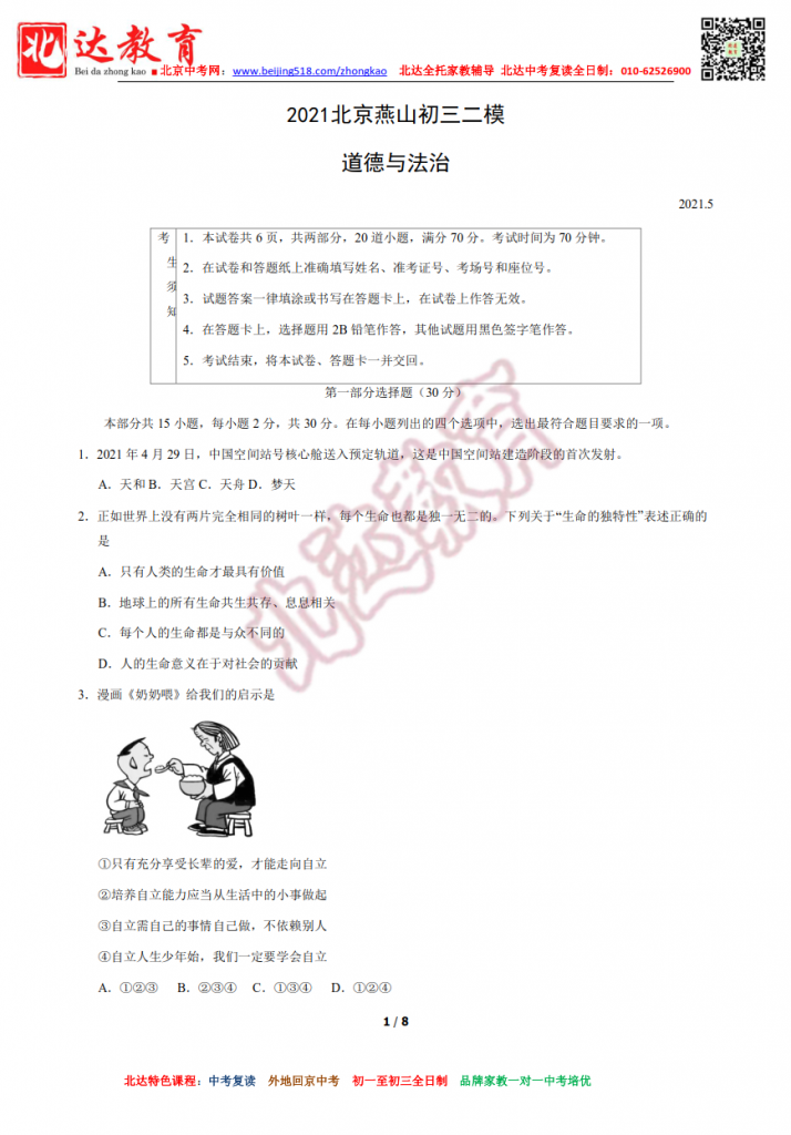 北京燕山2022初三二模道法试题及答案(高清版)!admw360中考复读学校教研组收集整理,分享给大家。