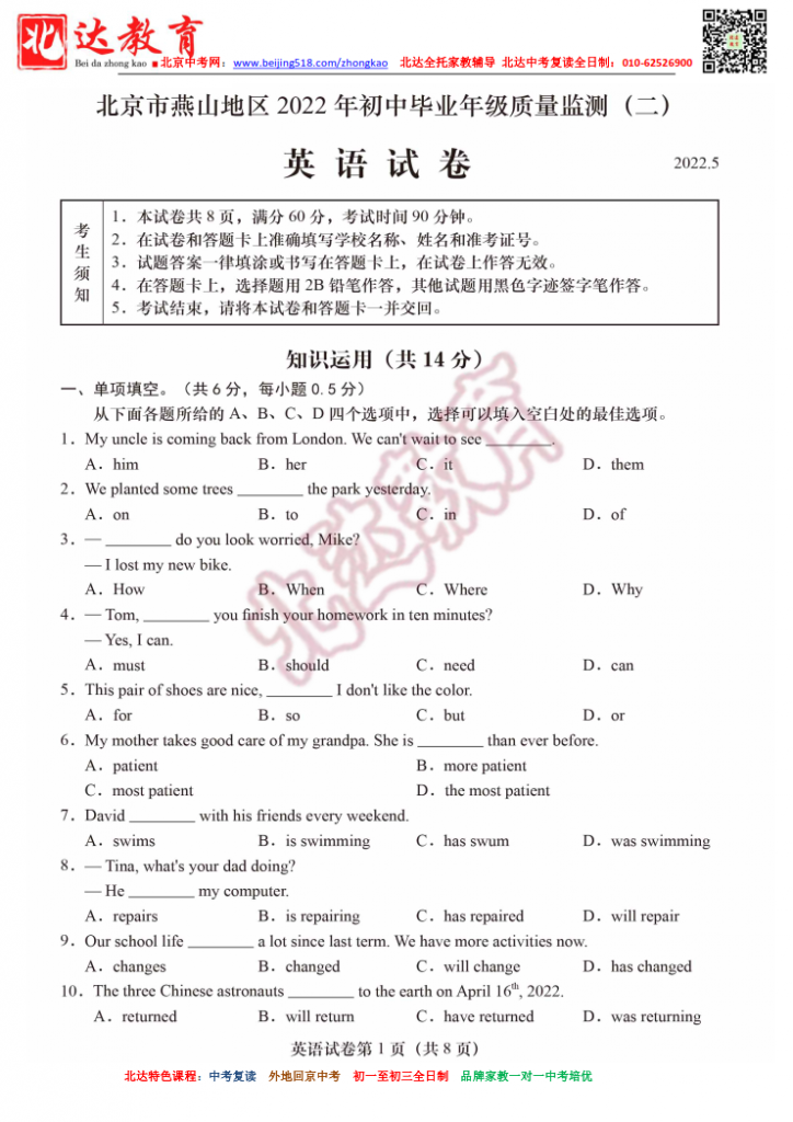 北京燕山2022初三二模英语试题及答案(高清版)!admw360中考复读学校教研组收集整理,分享给大家。