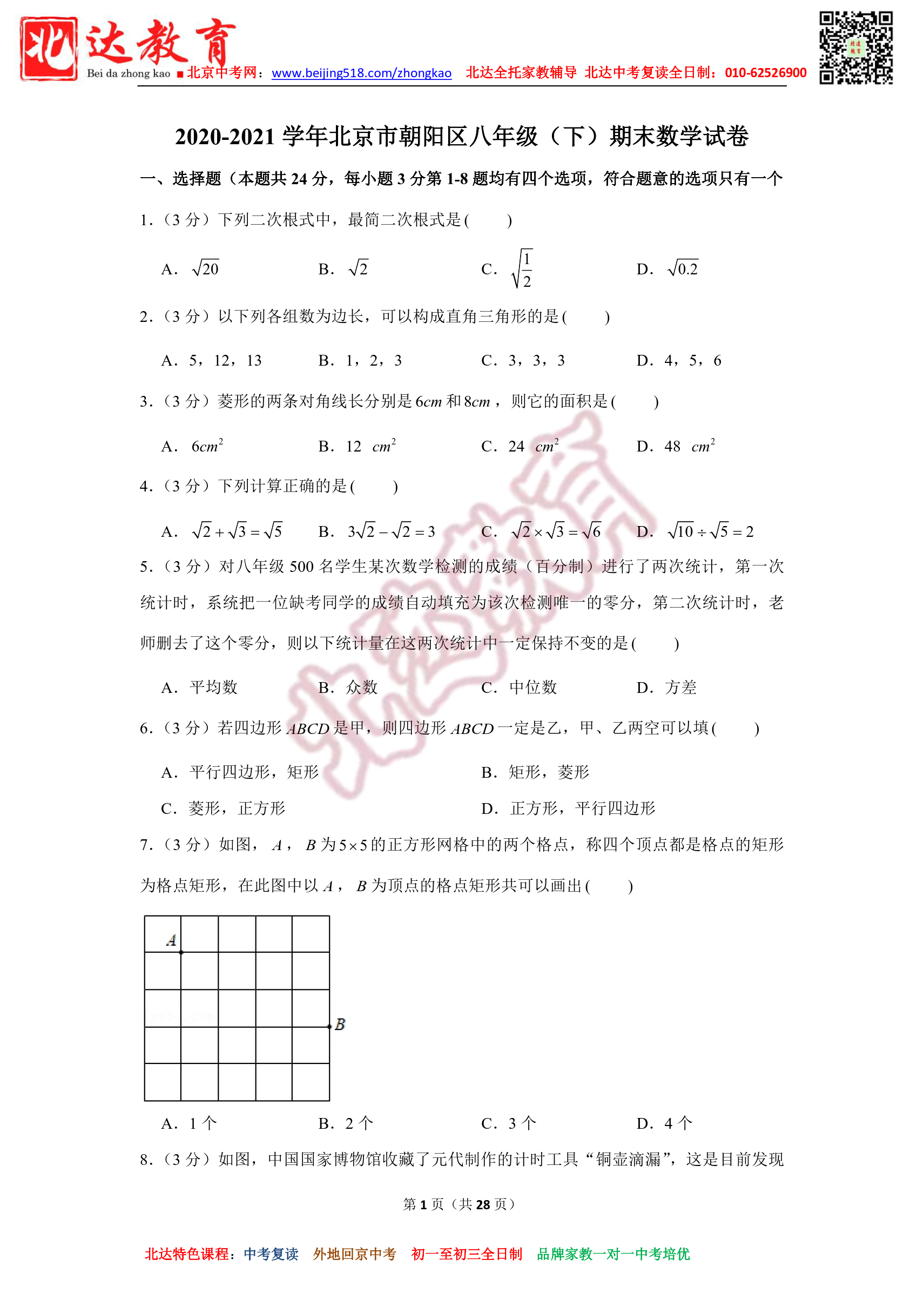 北京市朝阳区2020-2021学年八年级(下)期末数学试卷及解析