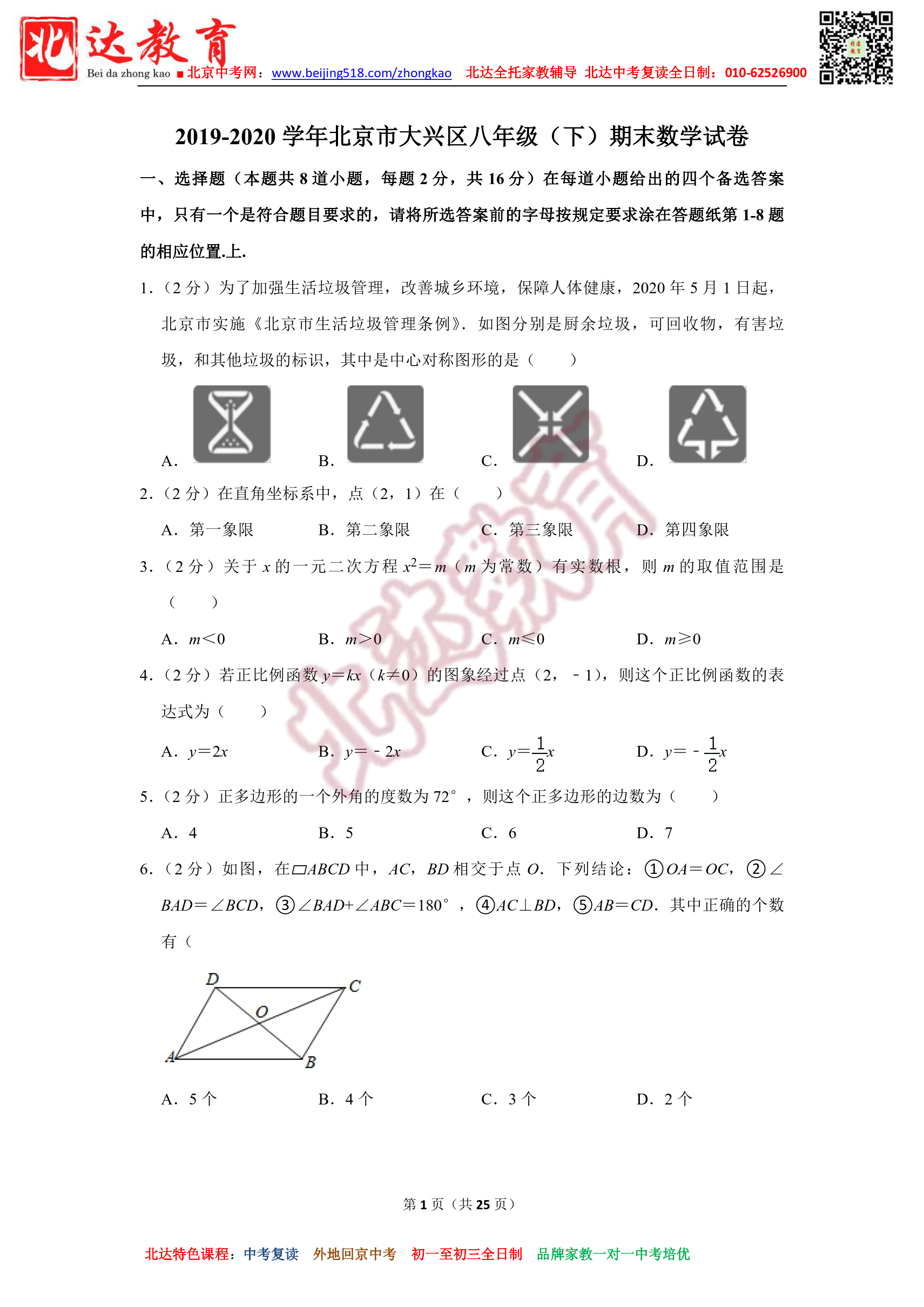 北京市大兴区2019-2020学年八年级(下)期末数学试卷及解析