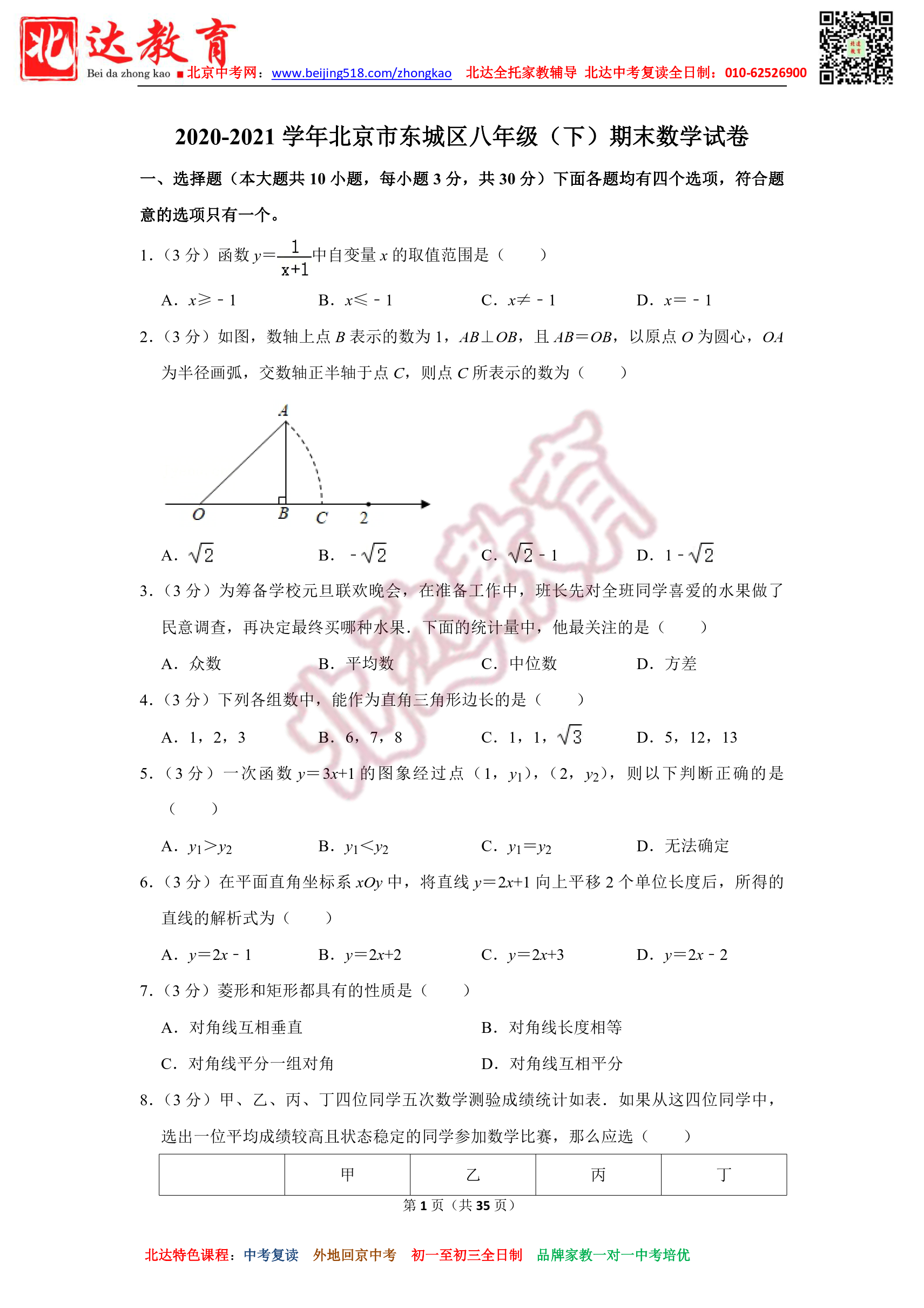 北京市东城区2020-2021学年八年级(下)期末数学试卷及解析