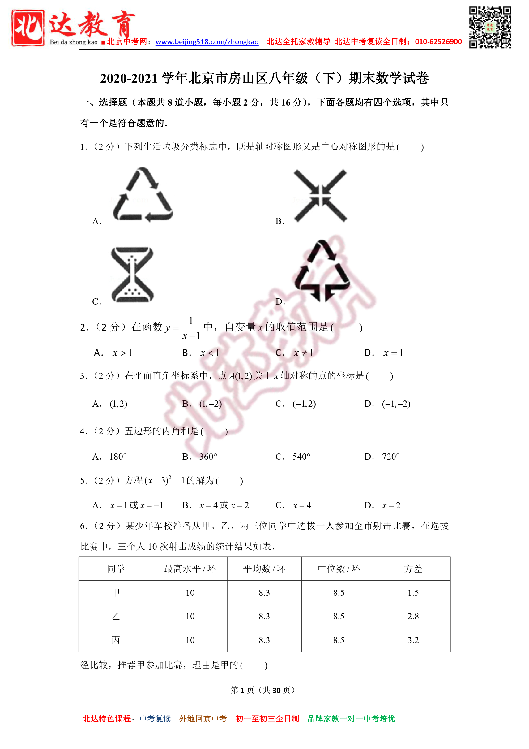 北京市房山区2020-2021学年八年级(下)期末数学试卷及解析