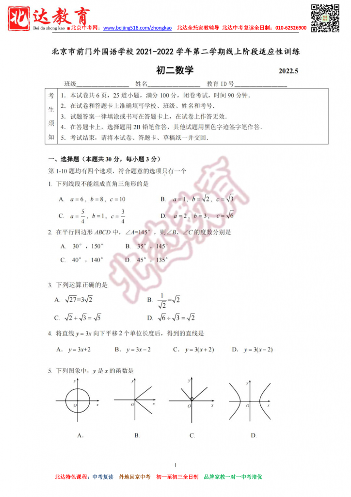 北京前门外国语学校2022八下数学线上阶段适应性训练(无答案高清版)。admw360中考复读学校教研组收集整理,分享给大家。