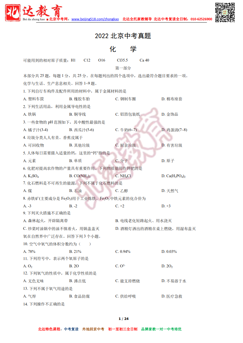 北京基教研专家:北京市2022年中考化学试卷权威解析!