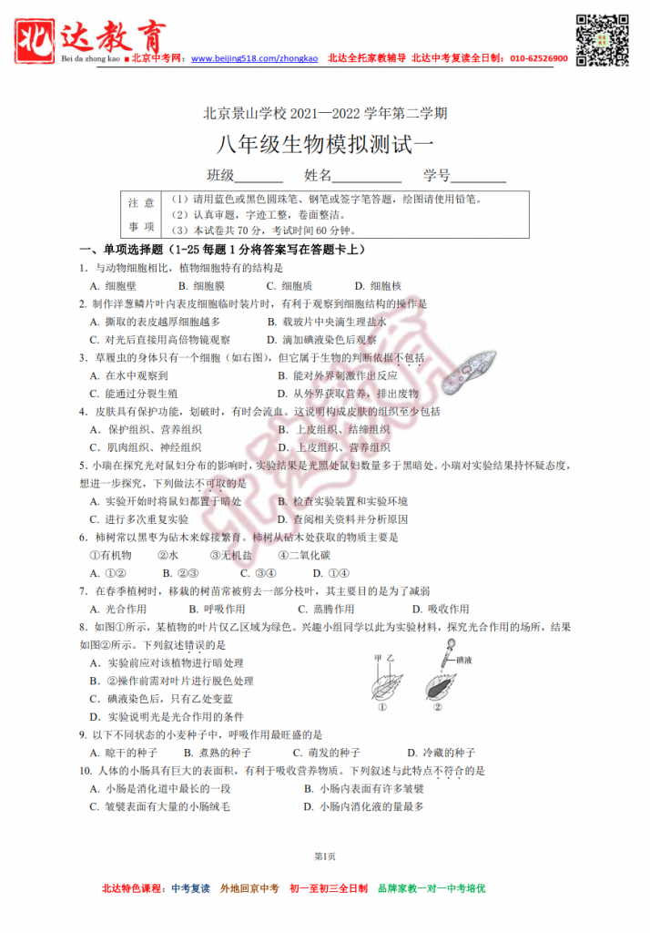 北京景山学校202205初二下生物模拟试卷(高清版)。admw360中考复读学校教研组收集整理,分享给大家。