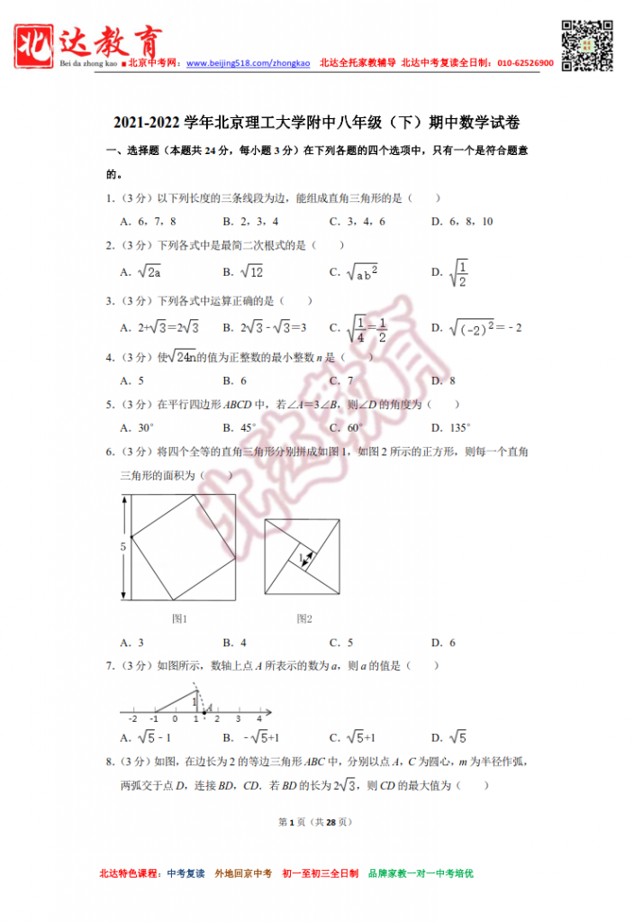 北京理工大学附中2022八下期中数学试卷及答案(高清版)。admw360中考复读学校教研组收集整理,分享给大家。
