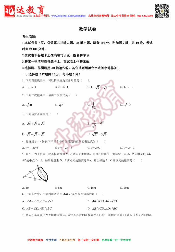 北京四中2022初二下期中数学试题及解析(高清版)。admw360中考复读学校教研组收集整理,分享给大家。