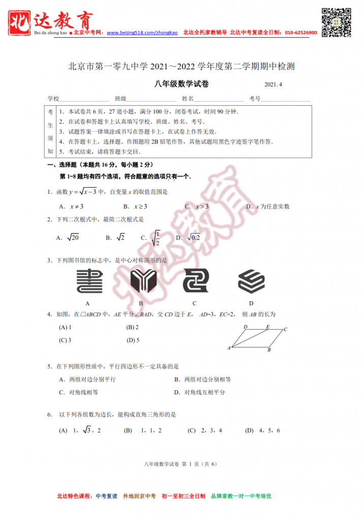 北京一零九中2022初二下期中数学试卷(高清版)。admw360中考复读学校教研组收集整理,分享给大家。