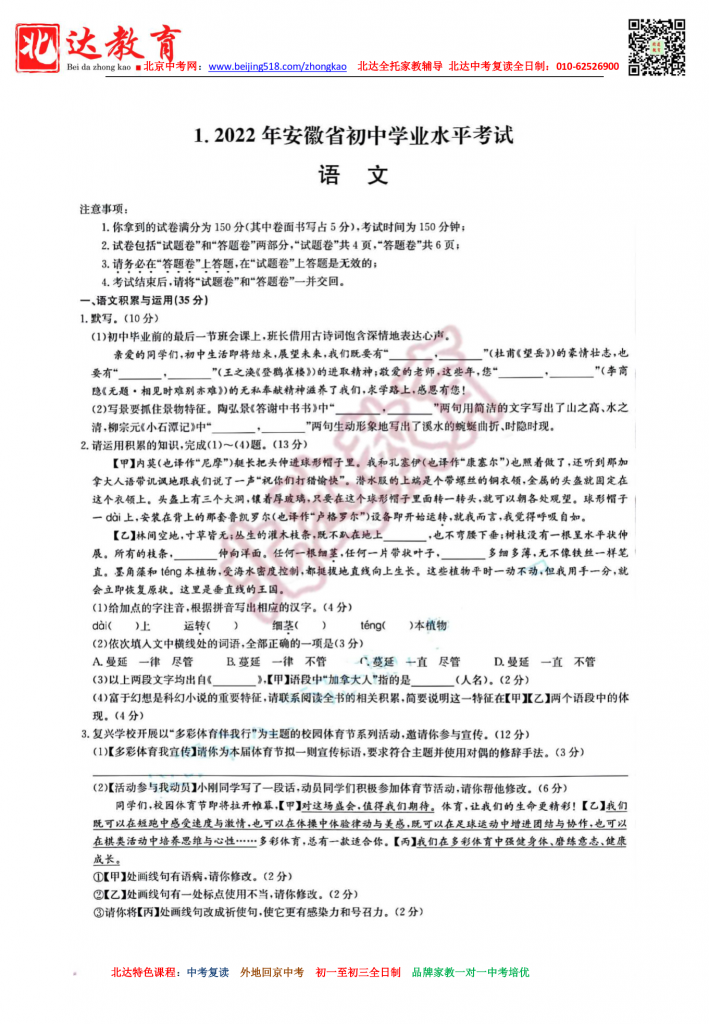 安徽2022中考各科真题含答案(全科高清版)。admw360中考复读学校教研组收集整理,分享给大家。
