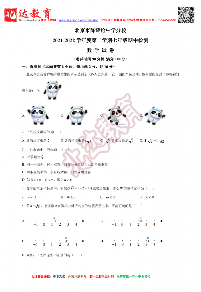 北京陈经纶中学分校2022七下期中数学试题及答案(高清版)。admw360中考复读学校教研组收集整理,分享给大家。