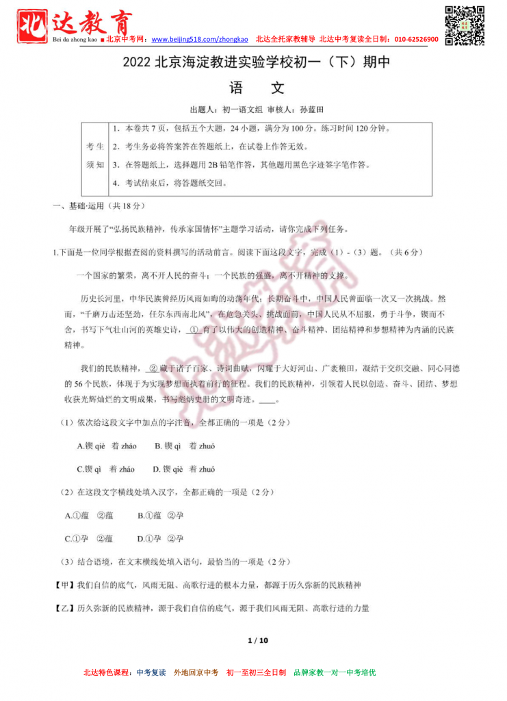 北京海淀教进实验学校2022初一下期中语文试题及答案(高清版)。admw360中考复读学校教研组收集整理,分享给大家。