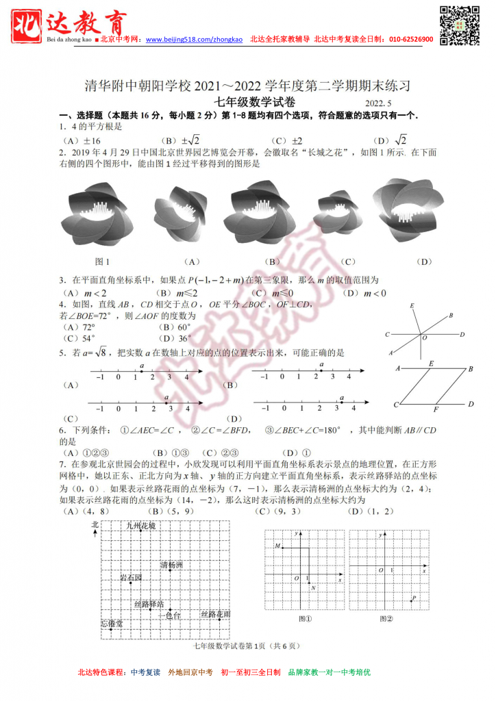 北京清华附中朝阳学校202205初一下数学期末练习(高清版)。admw360中考复读学校教研组收集整理,分享给大家。