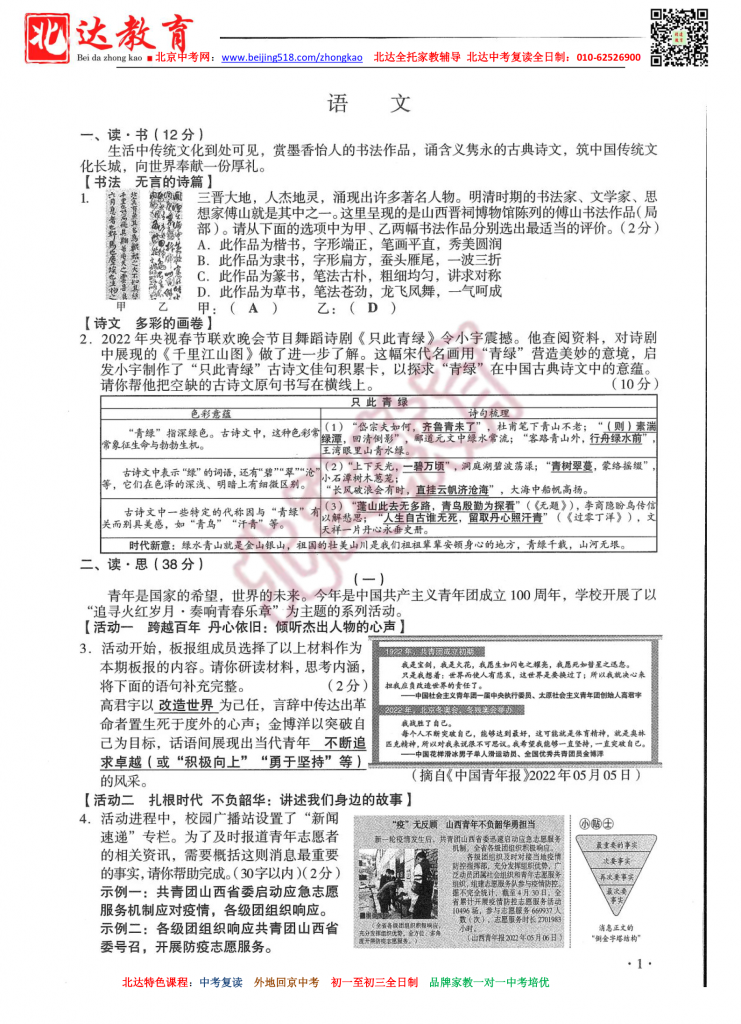 山西2022中考各科真题含答案(全科高清版)。admw360中考复读学校教研组收集整理,分享给大家。