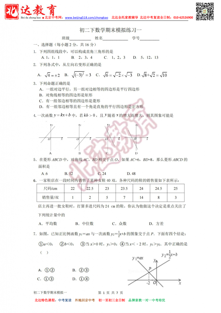 北京一六一中学2022八下数学期末模拟练习一(高清版)。admw360中考复读学校教研组收集整理,分享给大家。