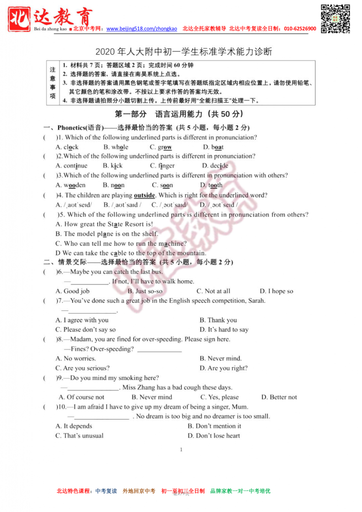 北京人大附中2021初一能力诊断英语试卷(无答案高清版)。admw360中考复读学校教研组收集整理,分享给大家。